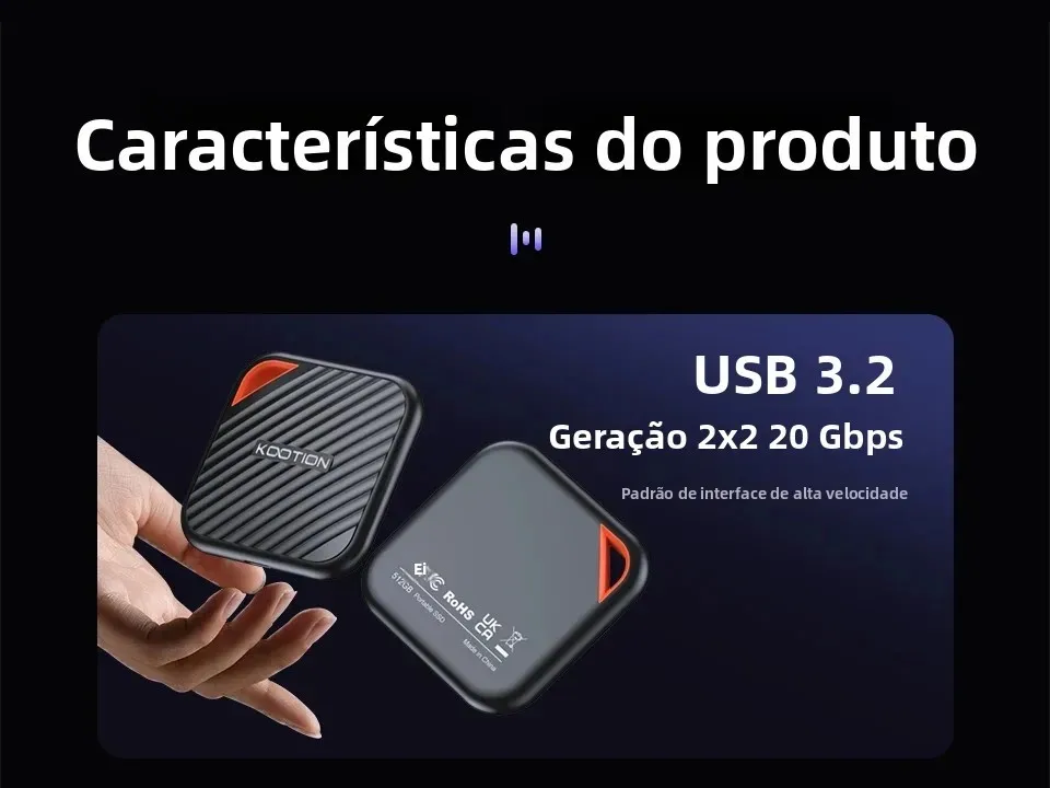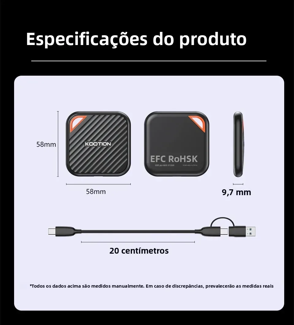 Não perca a oportunidade de adquirir um dos melhores SSDs portáteis do mercado brasileiro. Invista em alta tecnologia, qualidade, velocidade e capacidade para o seu dia a dia. Com o KOOTION X6Max SSD portátil, você terá desempenho excepcional, segurança reforçada e mobilidade total ao alcance de um cabo USB-C.