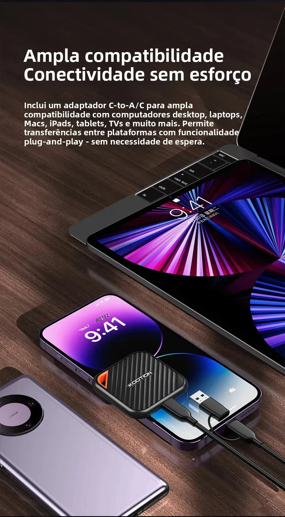 Quer seja no Windows, macOS, Linux ou outros sistemas que suportam USB-C e USB 3.2, o KOOTION X6Max SSD externo é plug-and-play, funcionando imediatamente ao ser conectado, sem necessidade de instalar softwares auxiliares. A compatibilidade com uma ampla gama de dispositivos torna este SSD uma escolha inteligente para usuários de diferentes perfis, inclusive gamers, estudantes, profissionais liberais e empresas.