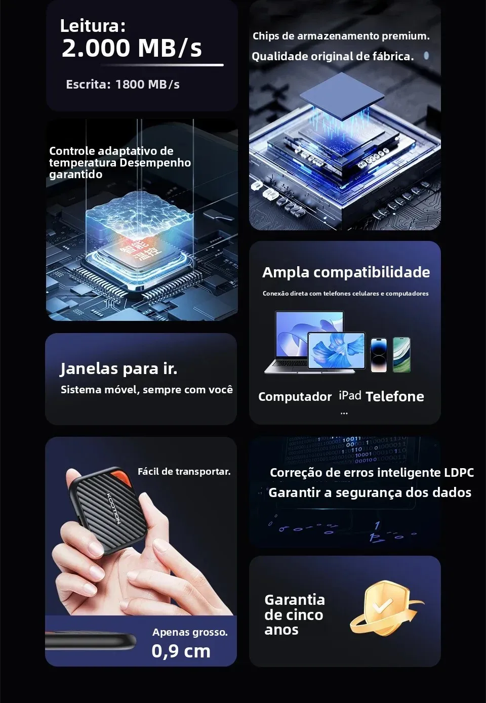 💼 Escolha a capacidade ideal – 512 GB, 1 TB ou 2 TB – e organize seus dados do jeito que preferir.